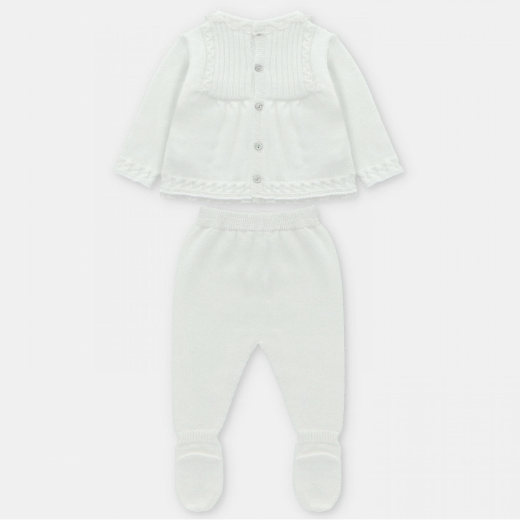 - Conjunto de punto compuesto por jersey y polaina en color blanco roto.